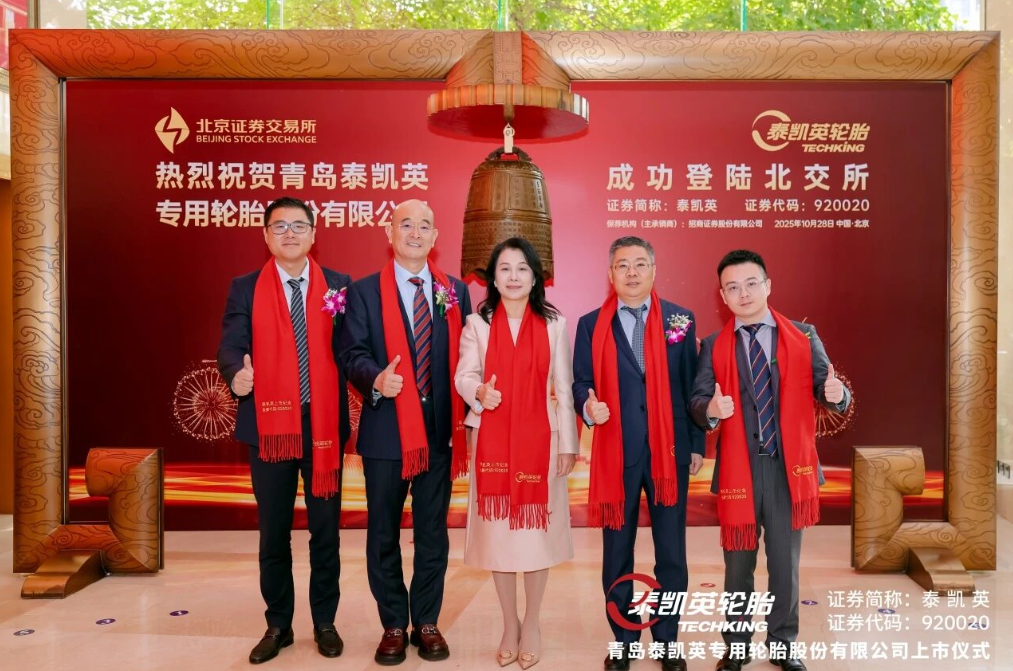 10月28日上午9点30分,北京证券交易所内钟声敲响,青岛泰凯英专用轮胎股份有限公司(股票简称:泰凯英,股票代码:920020)正式挂牌上市,成为资本市场新焦点,这标志着这家青岛“专精特新”企业步入全新发展阶段。
