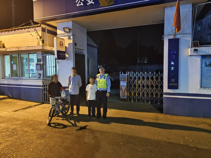 10月12日19时许,金山公安分局松隐派出所值班民警严佳康在派出所门口发现一名推着自行车的男孩正焦急徘徊。见状,严佳康立即上前询问。男孩带着哭腔说:“警察叔叔,我找不到家了……”民警一边安抚男孩情绪,一边耐心了解情况。原来,男孩当晚觉得在家无聊,便独自骑上自行车从干巷出发前往松隐。本以为之前随大人骑过几次,对路线有印象,可天黑后周围环境越来越陌生,他一下子慌了神,只好来到派出所求助。